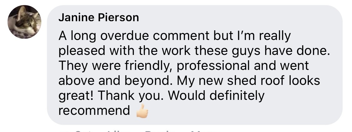 Beta Roofs undertake jobs big and small, with the same aim. To ensure the customer is left happy and receives a great service. Just like Janine, when we completed her new shed roof!